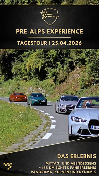 Die Mischung machts! Das ist die Touren-Philosophie von Stardrive Experience. Zum Einen bei angenehmer Fahrweise die traumhaft gelegenen Seen- und Berglandschaften genießen und diese auf sich wirken lassen. Zum Anderen die dynamische und sportliche Fahrweise auf kurvenreichen Pässen & Strecken. Somit kombinieren wir den Fahrspaß mit einem sehenswerten Panorama-Erlebnis auf unseren Sportwagentouren.