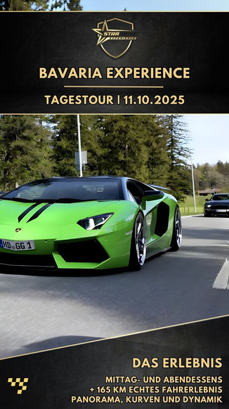 Die Mischung machts! Das ist die Touren-Philosophie von Stardrive Experience. Zum Einen bei angenehmer Fahrweise die traumhaft gelegenen Seen- und Berglandschaften genießen und diese auf sich wirken lassen. Zum Anderen die dynamische und sportliche Fahrweise auf kurvenreichen Pässen & Strecken. Somit kombinieren wir den Fahrspaß mit einem sehenswerten Panorama-Erlebnis auf unseren Sportwagentouren.